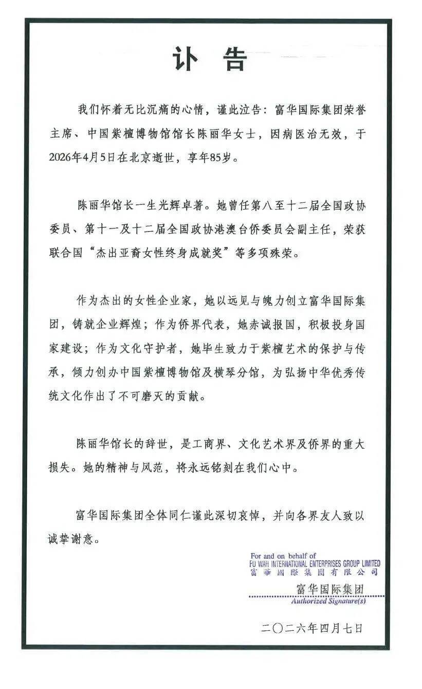 据澎湃新闻消息,4月7日,富华国际集团发讣告:我们怀着无比沉痛的心情,谨此泣告:富华国际集团荣誉主席、中国紫檀博物馆馆长陈丽华女士,因病医治无效,于2026年4月5日在北京逝世,享年85岁。
