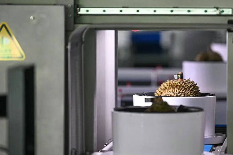 在位于海南三亚的海南省优旗农业有限公司榴莲加工厂,国产榴莲在榴莲智能分选生产线上接受检测。