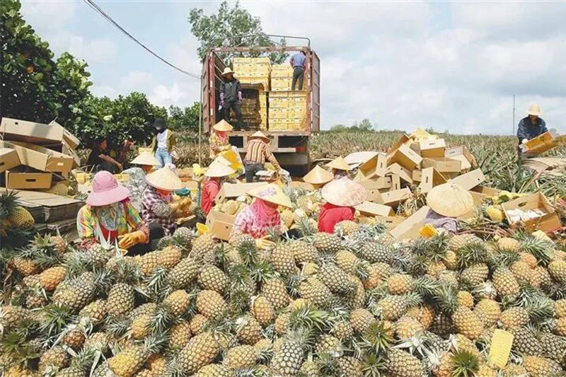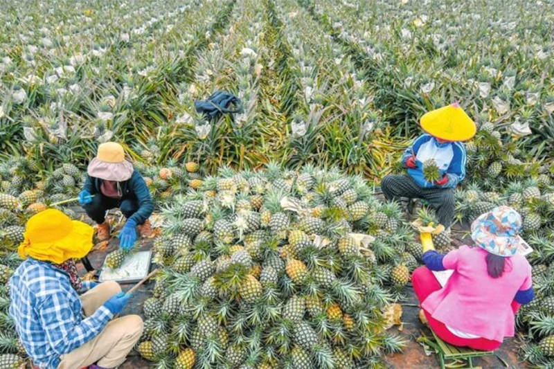 海口大致坡镇美峰村里,农户们正在处理丰收的凤梨。