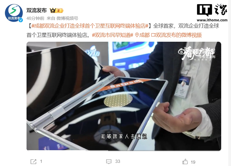 IT之家 11 月 19 日消息,据“双流发布”今日消息,成都迅翼卫通科技有限公司(StarWin)“迅翼卫通”卫星互联网线下体验店于 11 月 18 日正式开业运营,这是全球首个卫星互联网终端体验店。
